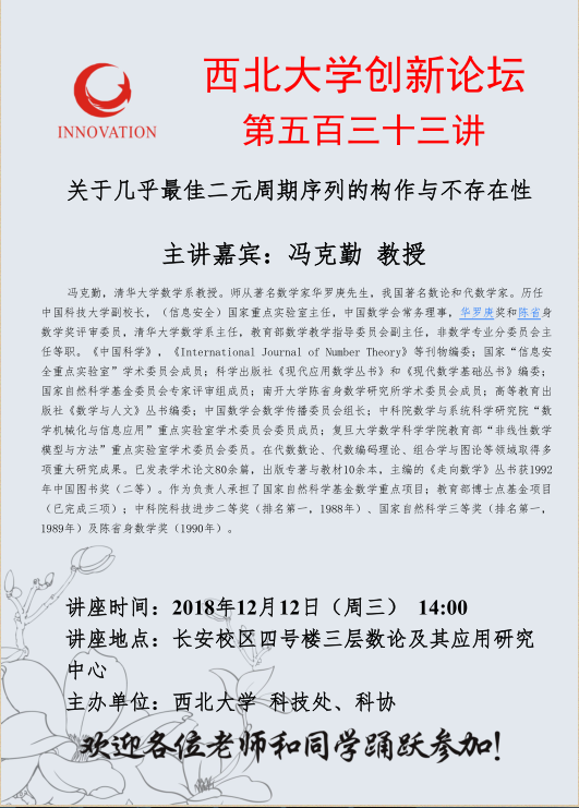 jdb电子中国官方网站创新论坛第五百三十三讲:关于几乎最佳二元周期序列的构作与不存在性