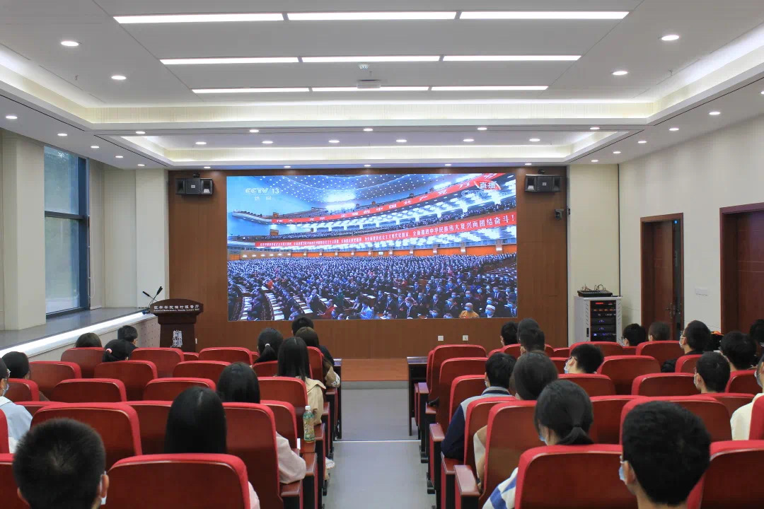 (驻校学生干部、学生党员代表、学院青骨营全体营员线下观看开幕式)