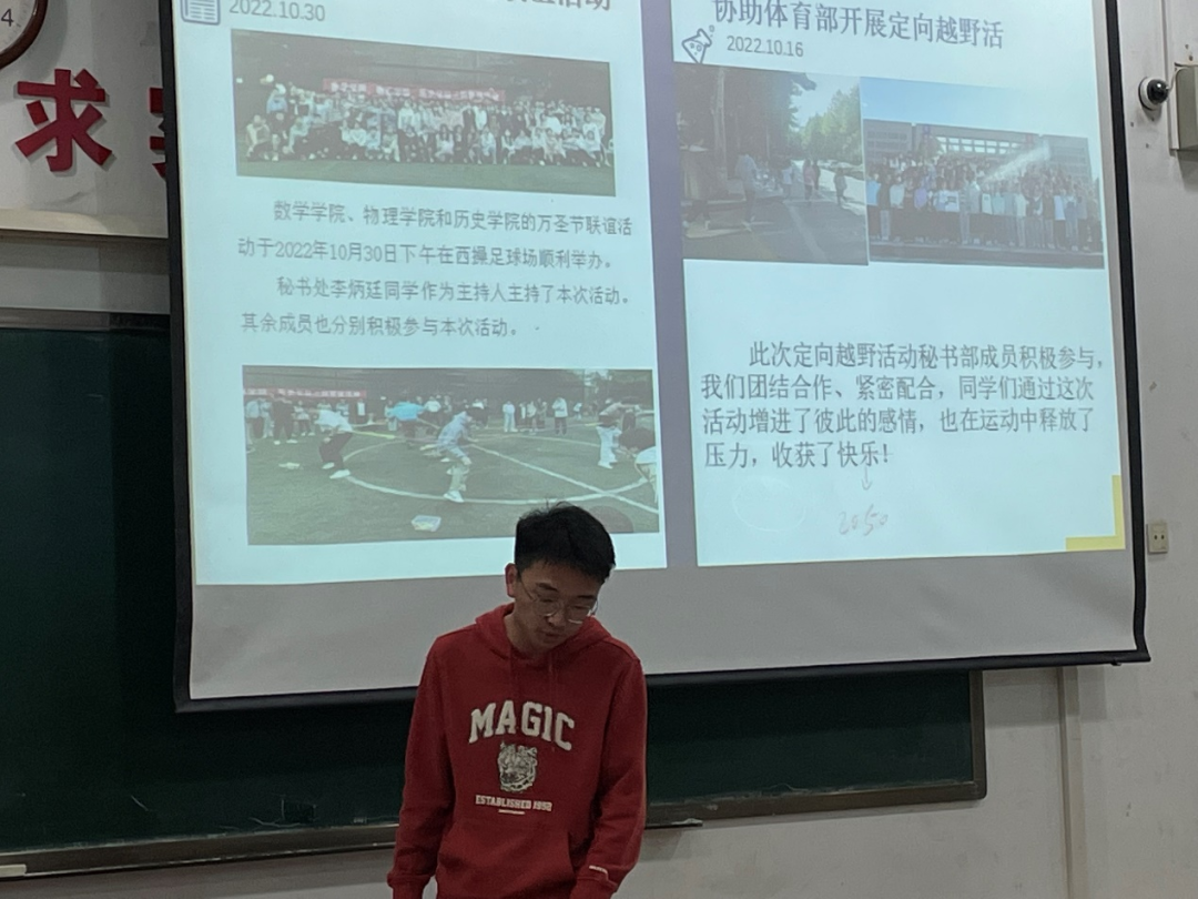 在上一学期的工作中,秘书处成功举办了jdb电子中国官方网站主持人大赛、完成每日晚自习查勤、协助体育部举办定向越野活动、 并协助公关部圆满举办三院联谊等工作。新的一学期里,秘书处也将继续增强部门凝聚力、总结完善不足、完成常规工作的同时加强部门交流,努力走向更好的未来!